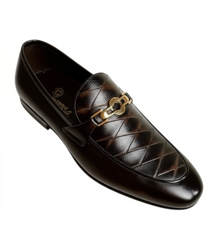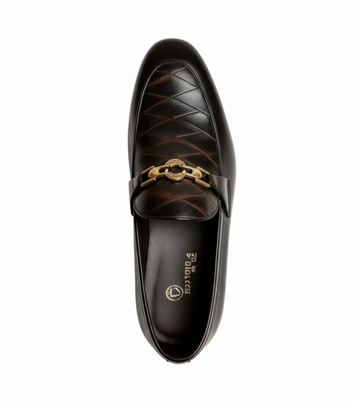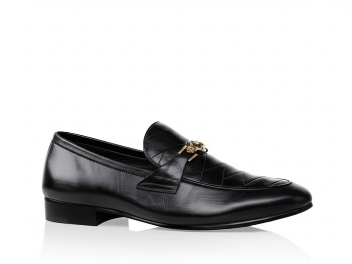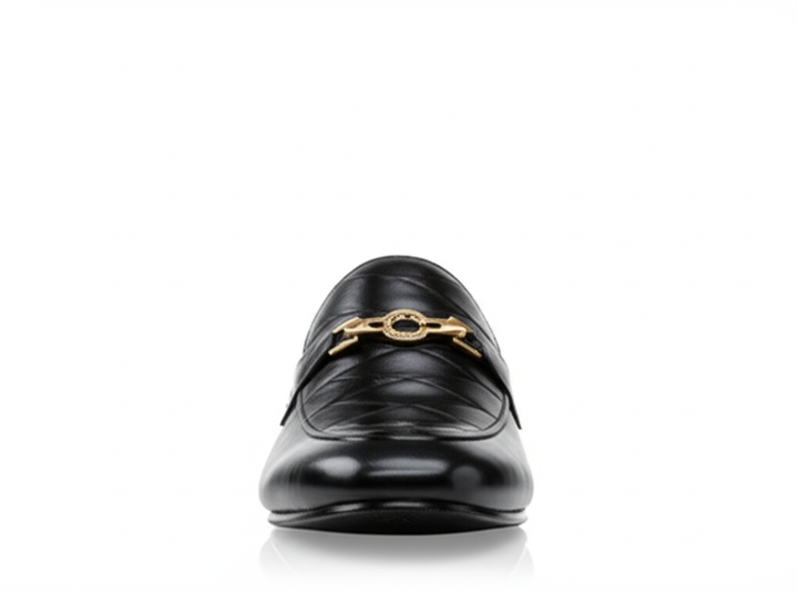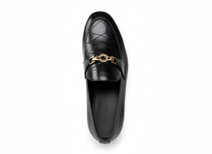 Step into timeless elegance with The Chairman loafer. Meticulously crafted from premium black leather, this shoe features a distinguished quilted vamp and is adorned with a classic gold-tone horsebit for a touch of refined luxury. Its sleek silhouette and superior comfort make it the perfect choice for the discerning gentleman, effortlessly taking you from the boardroom to an evening out.