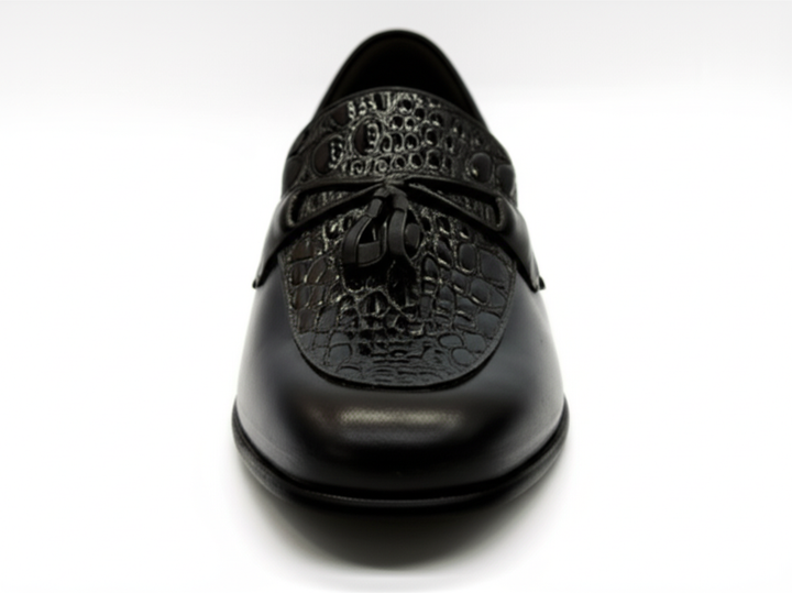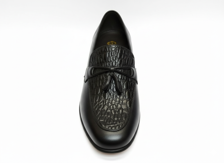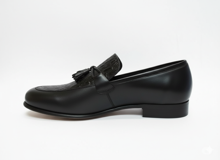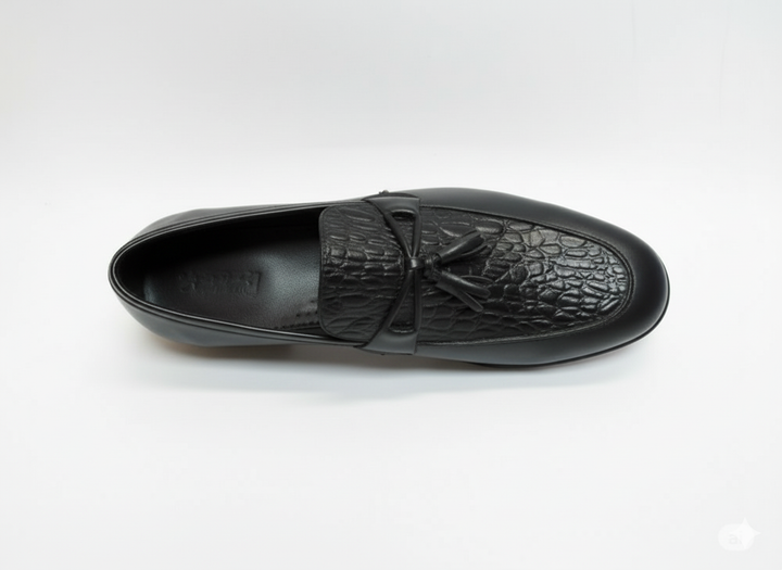 Step up your footwear game with our exquisite Men's Classic Leather Tassel Loafers. Meticulously crafted for the modern gentleman, these shoes blend timeless design with a touch of contemporary flair. The sophisticated silhouette is enhanced by a unique combination of smooth and crocodile-textured leather, making them a standout addition to any wardrobe. Whether you're heading to the office or a special event, these loafers will ensure you do so in style and comfort.